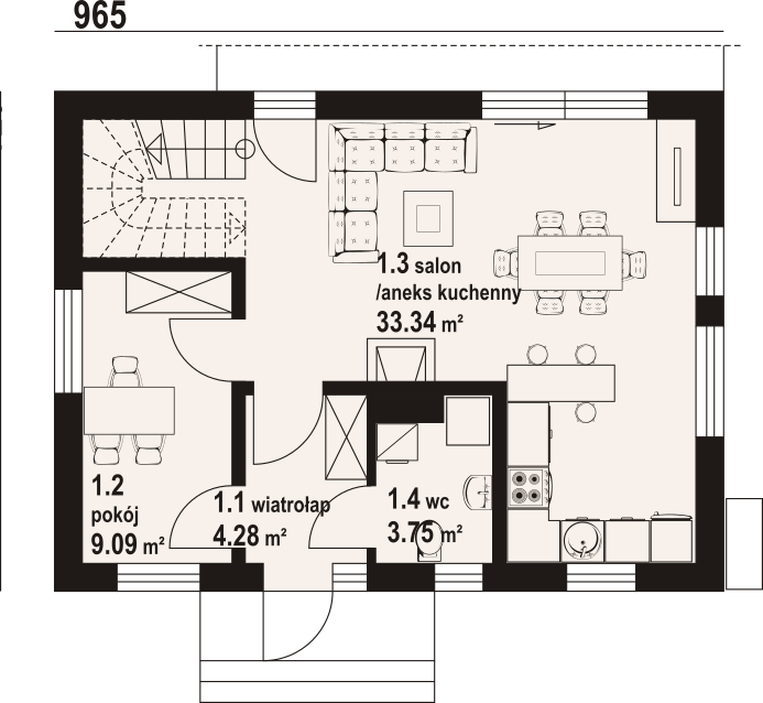 | 1.3 salon z aneksem kuchennym | 33,34 m² |