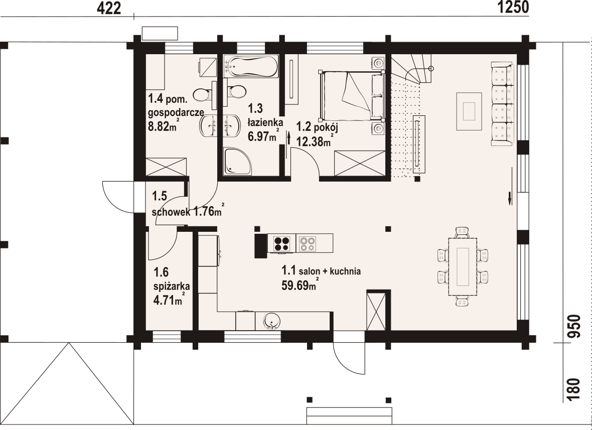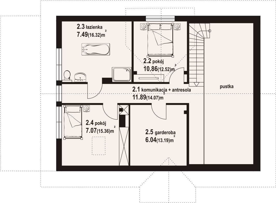| 2.1 komunikacja + antresola | 11,89 (14,07) m² |